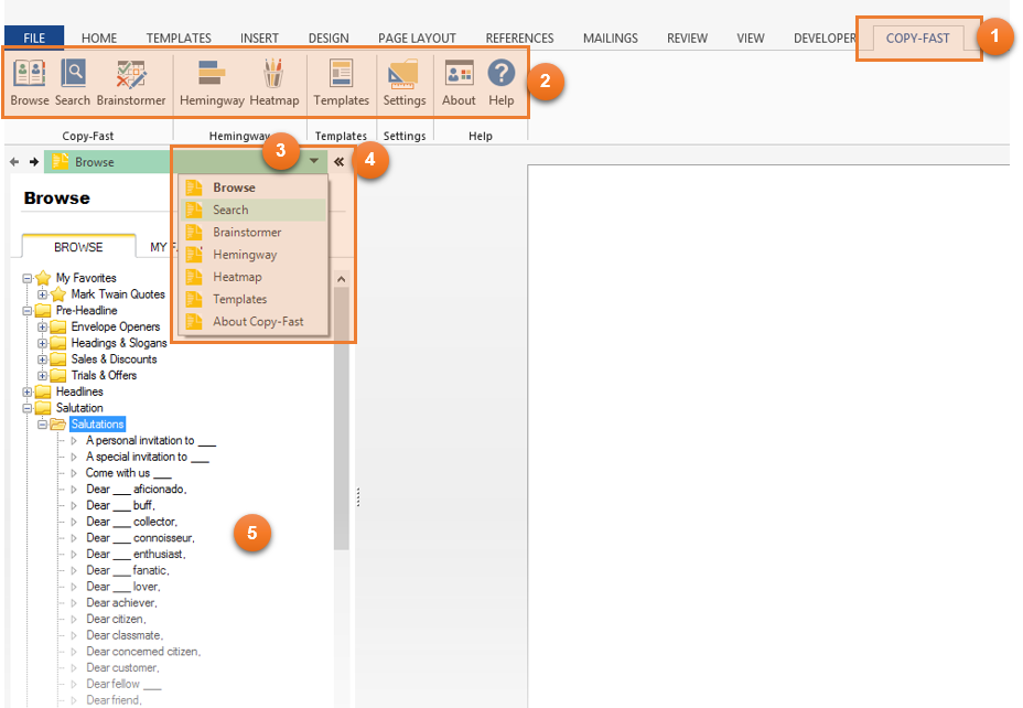 Copy-Fast is an add-in (also known as a ‘plug-in’) for Microsoft Word for Windows. It integrates seamlessly into Microsoft Word so everything you need to write great copy productively – including emails, sales letters, blog posts and more – is in one place.